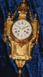 Kurzbeschreibung: Eine französische Wandcartelluhr aus feuervergoldeter Bronze.Sie hat ein Emailzifferblatt mit blauen Zahlen und eine Gangdauer von 8-10