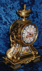 Kurzbeschreibung: Eine Kaminuhr aus feuervergoldeter Bronze mit Sevre Porzellan.Sie hat ein 10 Tage Ankerwerk und Schlagwerk auf Glocke.Zwei brünierte Löwenköpfe